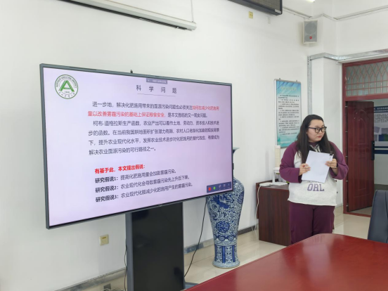 在互动过程中,与会师生围绕研究论文题目、研究假设提出及研究数据时效等问题展开热烈探讨。大家一致认为,该研究具有创新价值与现实意义,其以独特的研究视角回应了农业环境污染的关键议题,为相关领域研究提供了重要突破点。从理论贡献来看,该研究实现了农业经济学与环境科学的交叉融合,构建具有创新性的研究框架。与此同时,与会老师们也指出,研究对科学问题的表述与呈现方面尚有提升空间,建议应从实际数据和相关文献研究中寻找支撑,使得研究呈现更具逻辑性和说服力。此外,大家建议后续研究可扩大数据研究范围,与现有研究形成对比试验,深入分析雾霾污染产生的主要原因与作用路径。