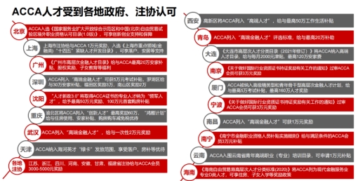 (三)ACCA会员资格在国内被广泛认可,多地政府都将ACCA持证人员列为稀缺性高端财会人才,包括上海、广州、深圳、成都、西安、厦门等在内的各大城市相继出台各项优待政策,ACCA持证人可享受积分落户、个税减免、专项奖金、置业补贴、子女入学等各项优待。