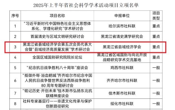 近日,黑龙江省社会科学界联合会公布了2025年度省社会科学学术活动项目评审结果,由黑龙江省县域经济学会申报的“第五次会员代表大会暨‘县域经济高质量发展’学术研讨会”成功获批重点项目。这一立项不仅体现了省社科联对县域经济研究的高度重视,也为黑龙江省县域经济的高质量发展提供了重要的学术支撑。