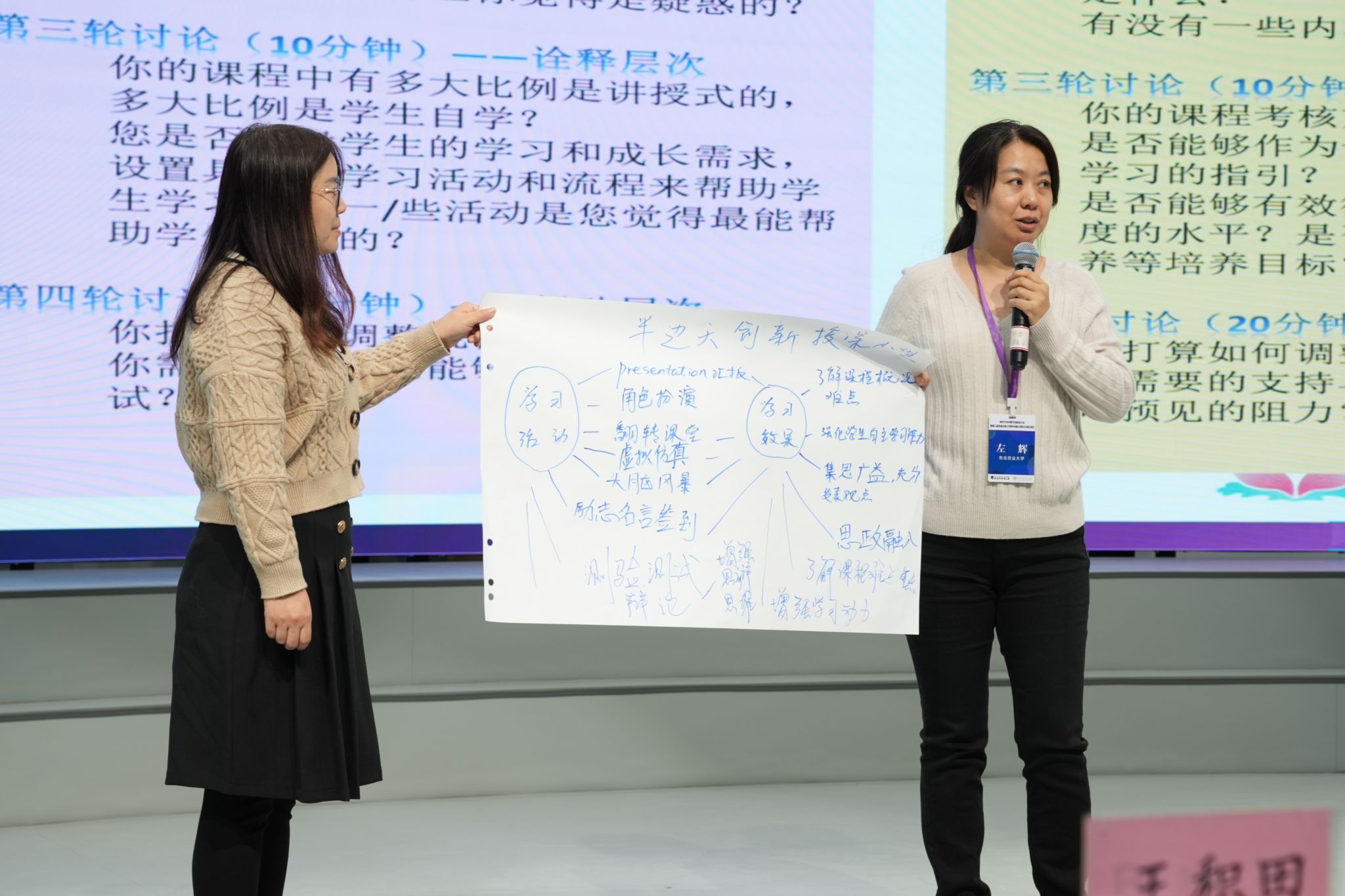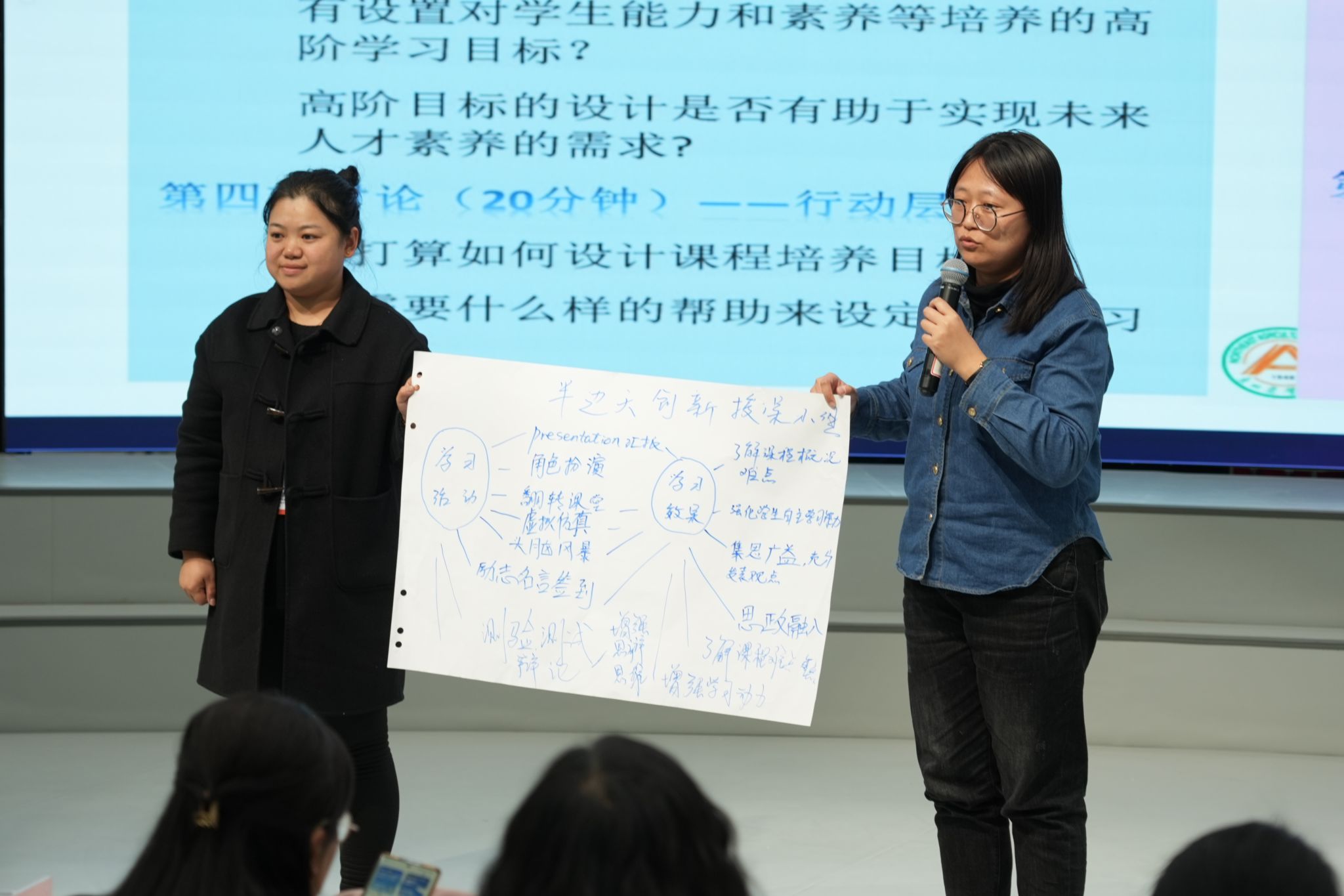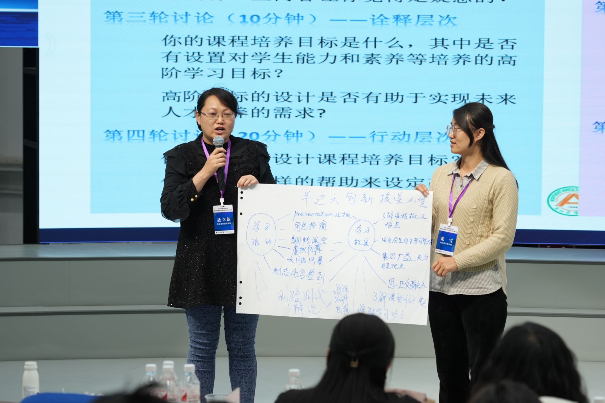 结合三位教师分享的优秀案例,大家在小组内针对教学创新过程中遇到的挑战进行情景重构,并将讨论出的行动方案上台进行了展示。