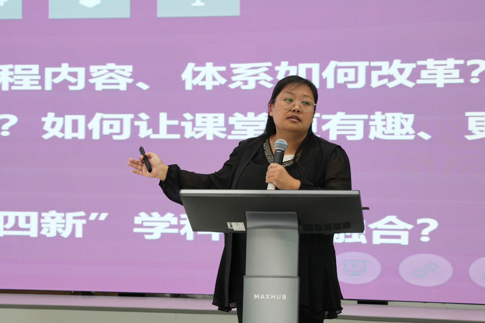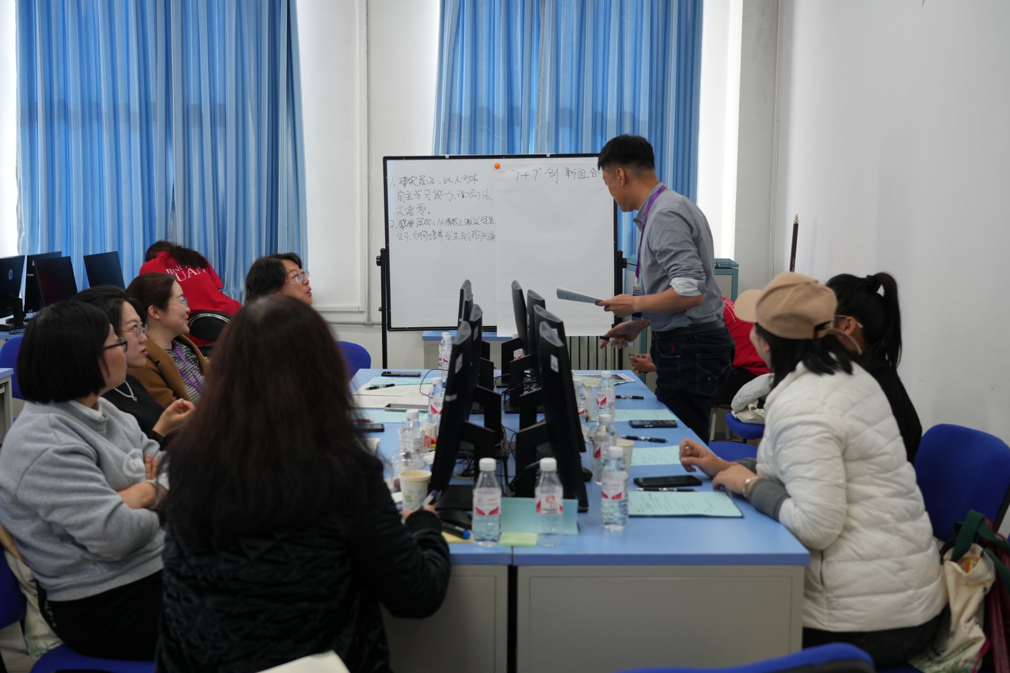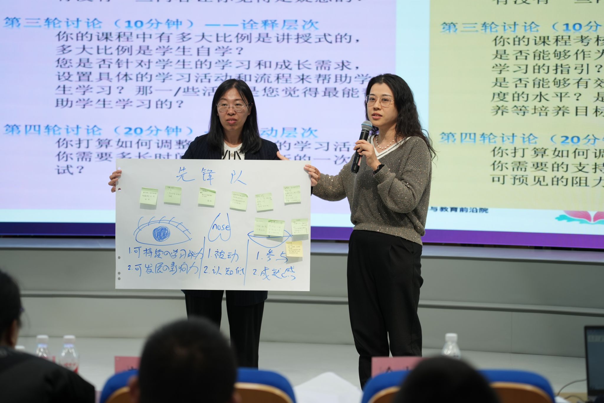 结合三位教师分享的优秀案例,大家在小组内针对教学创新过程中遇到的挑战进行情景重构,并将讨论出的行动方案上台进行了展示。