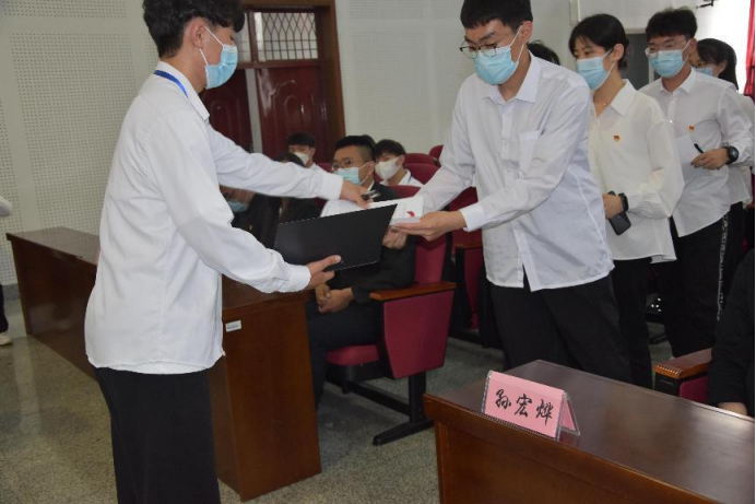 经济管理公司党委书记王洪亮,党委副书记刘刹、毕业班辅导员杨秀坤、孙宏烨、姜骥文老师为毕业生党员佩戴党徽,并发放党员提示卡。